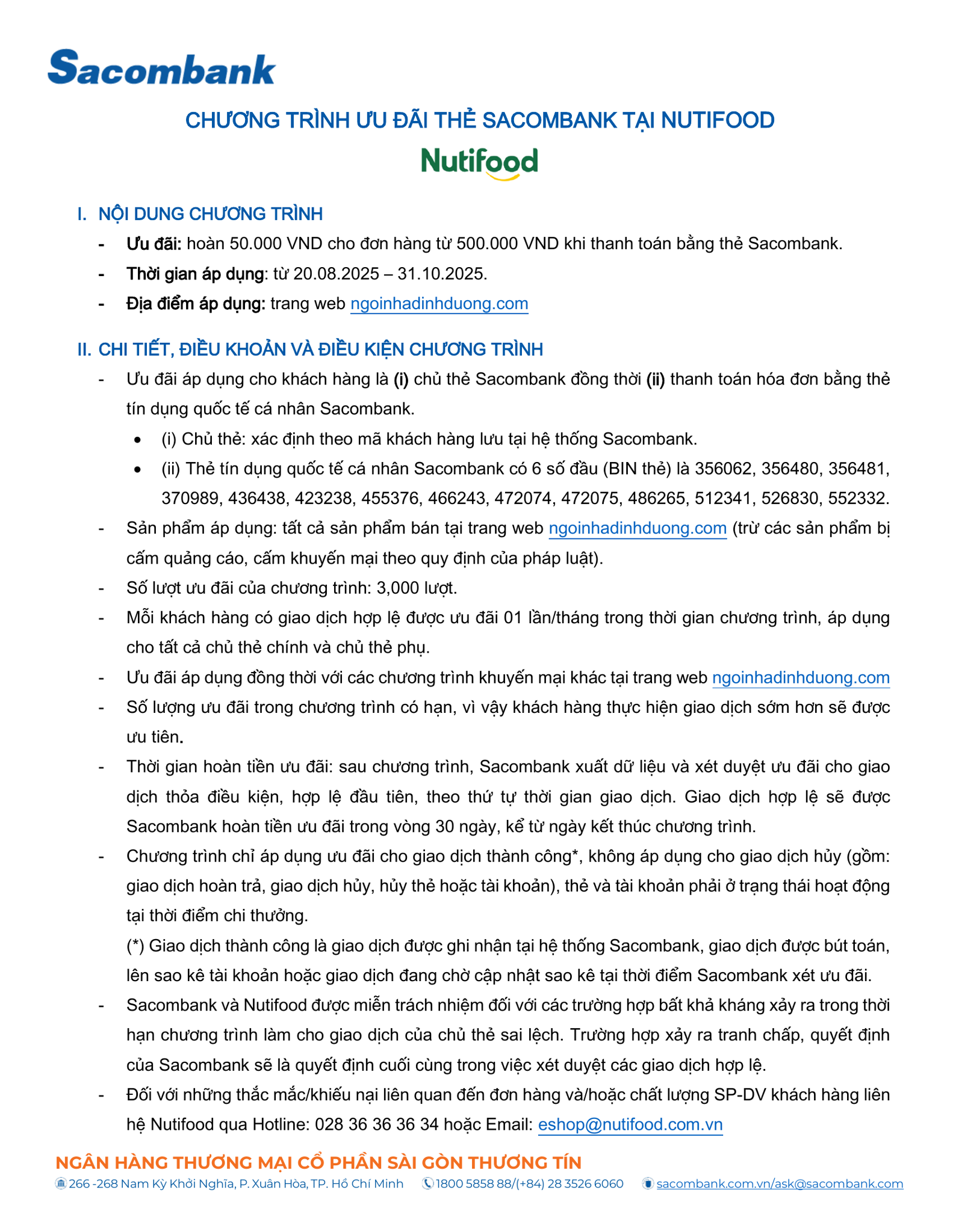 CHƯƠNG TRÌNH ƯU ĐÃI THẺ SACOMBANK TẠI WEBSITE NGOINHADINHDUONG.COM