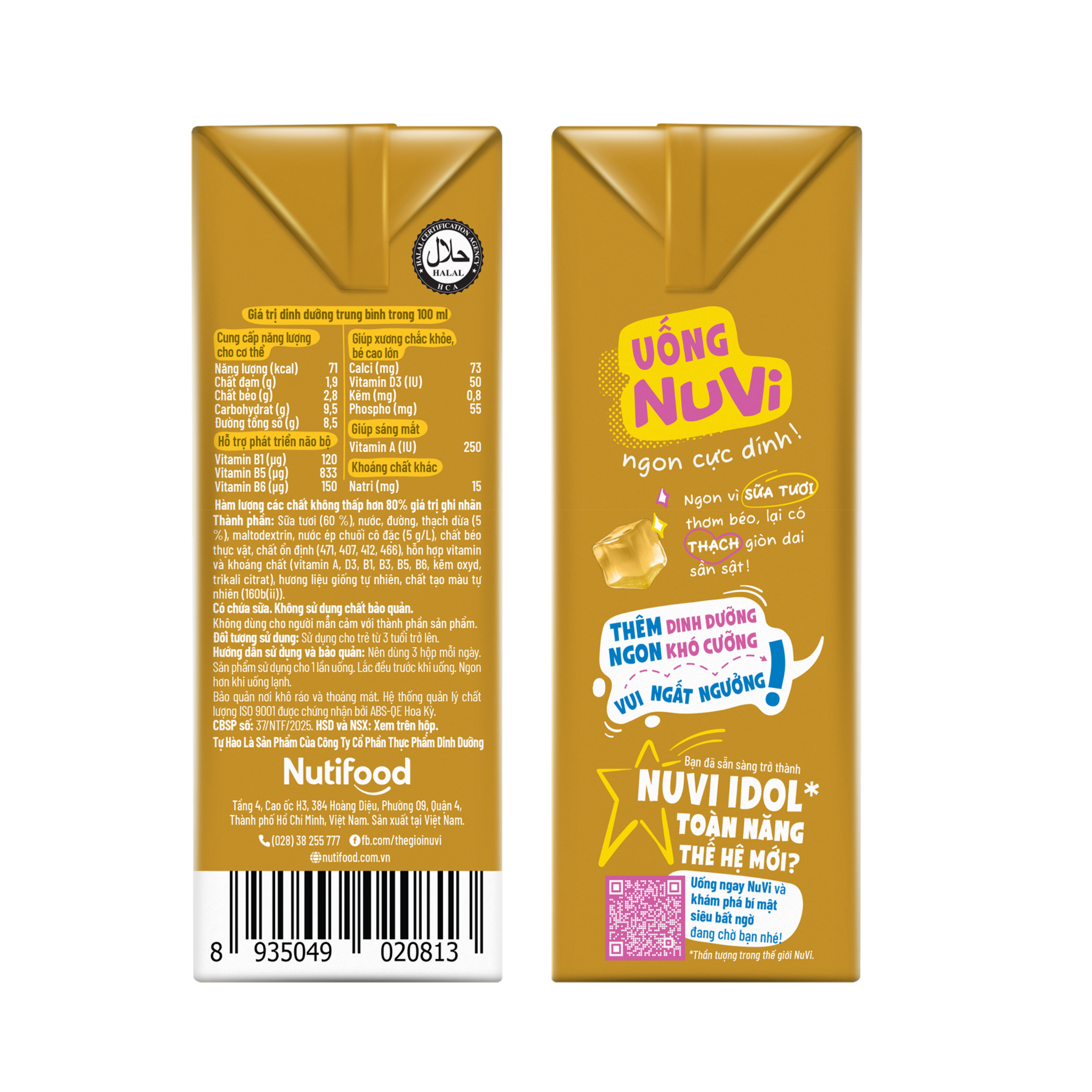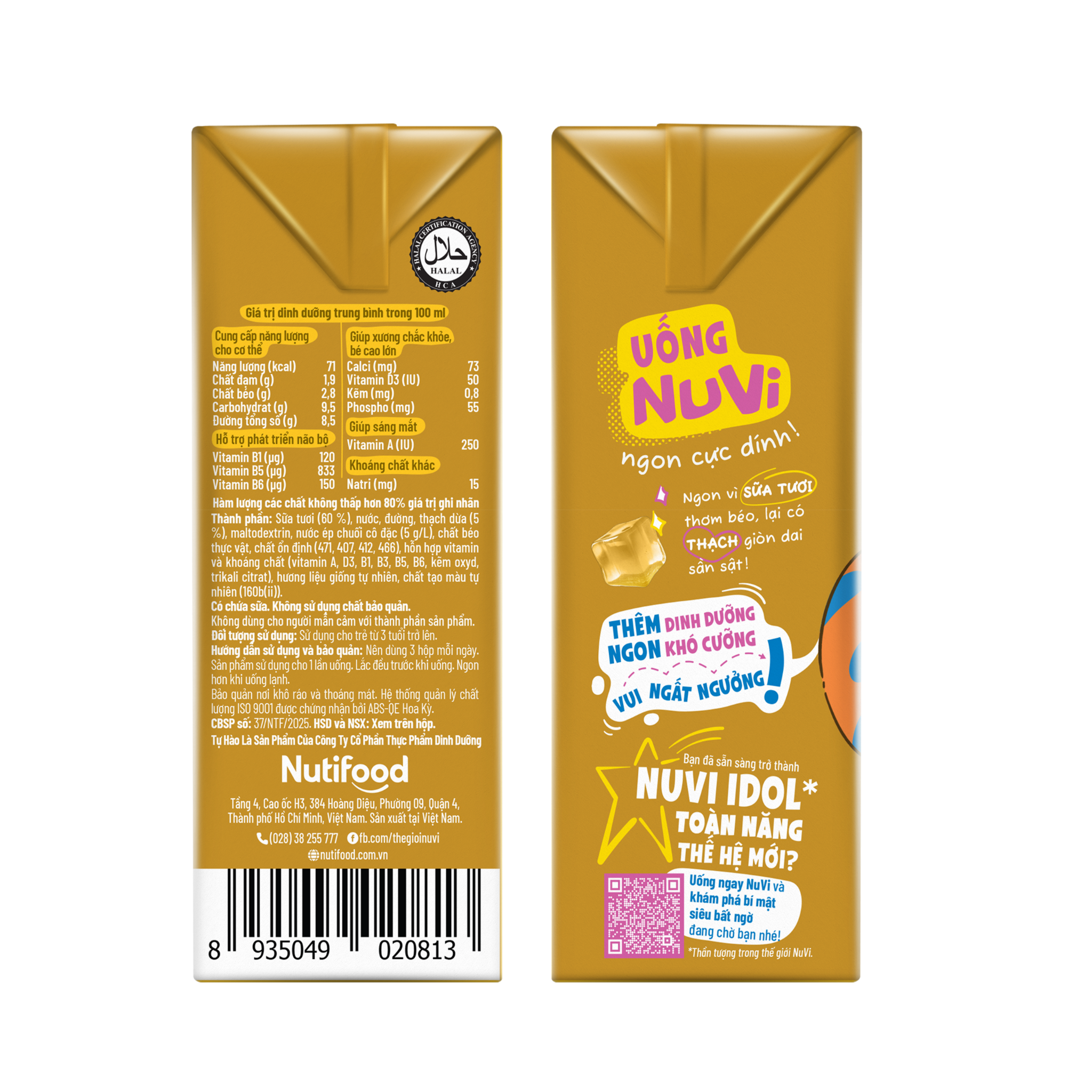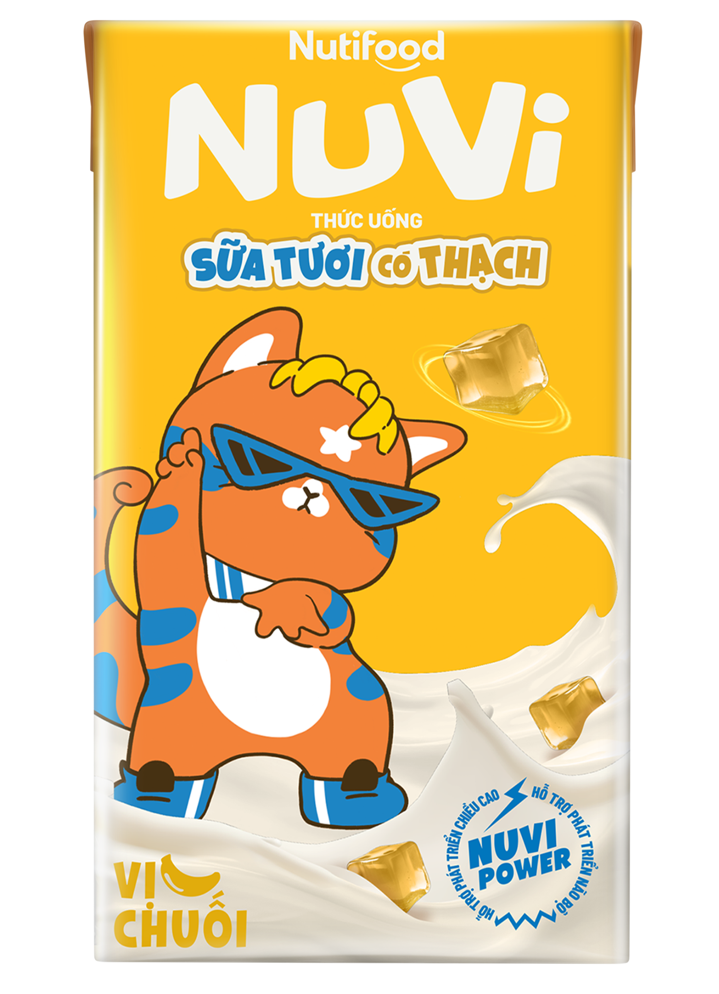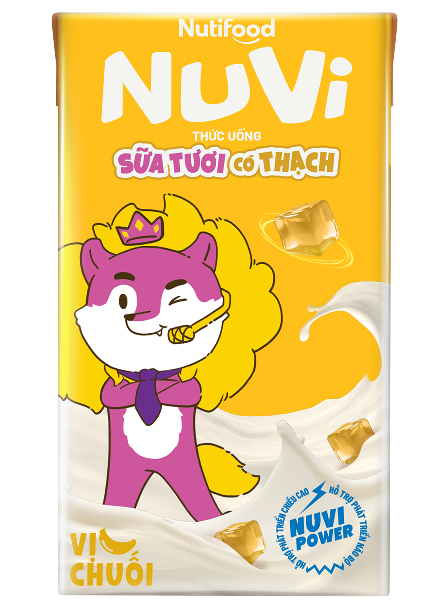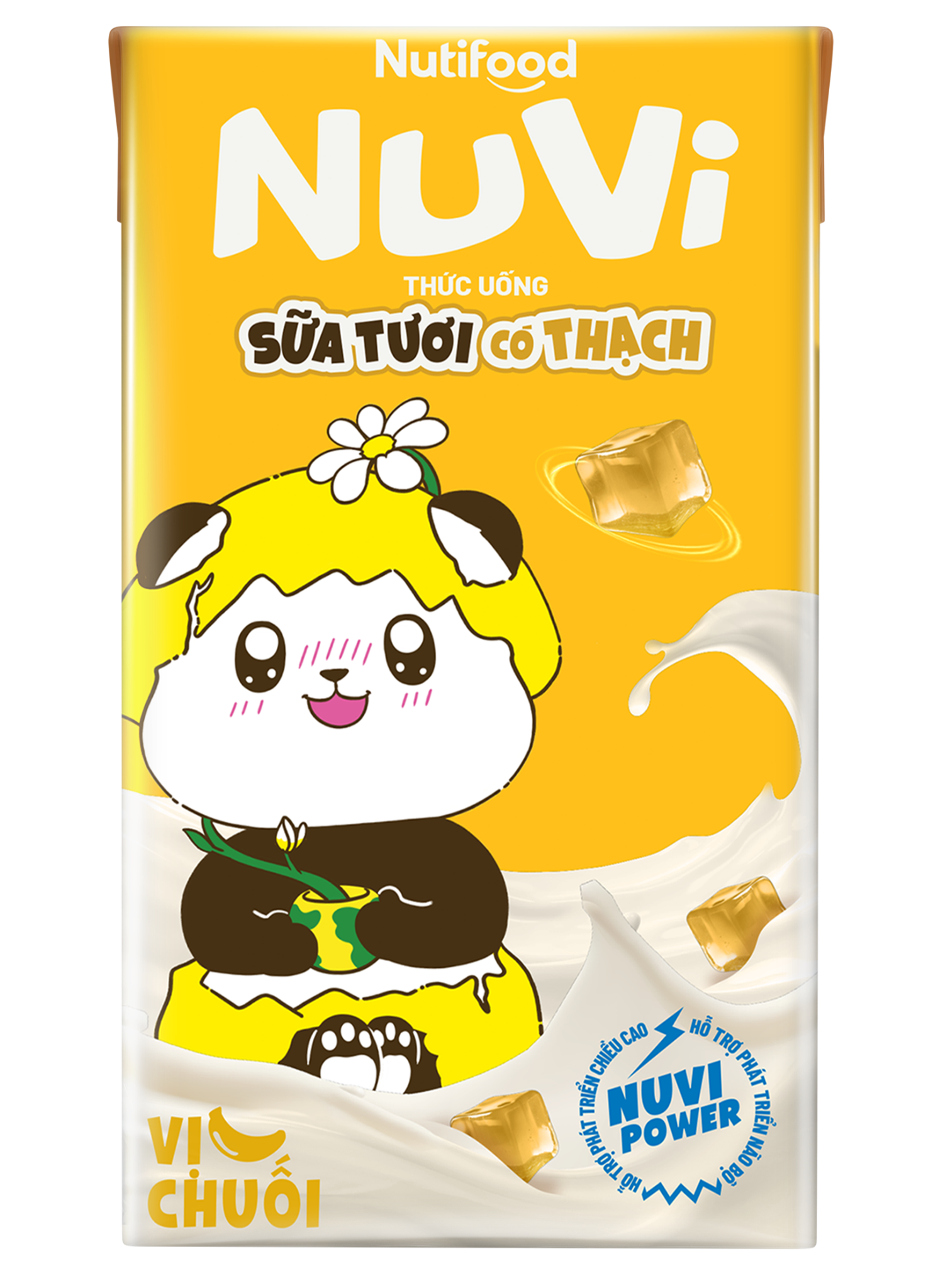 - NuVi Thức Uống Sữa Tươi Tiệt Trùng Vị Chuối Có Thạch chứa 60% SỮA TƯƠI SẠCH MỘT NGUỒN DUY NHẤT từ Trang trại bò sữa NutiMilk Gia Lai, sữa tuyệt ngon, vị chuối ngọt ngào, hòa quyện cùng thạch dai giòn, kết hợp ống hút siêu to cho trải nghiệm vừa hút vừa nhai cực đã.