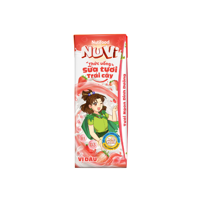 NuVi Thức Uống Sữa Tươi Trái Cây Vị Dâu được làm từ sữa tươi sạch từ trang trại bò sữa NutiMilk kết hợp cùng nước ép trái cây mang đến hương vị thơm ngon dinh dưỡng mỗi ngày.