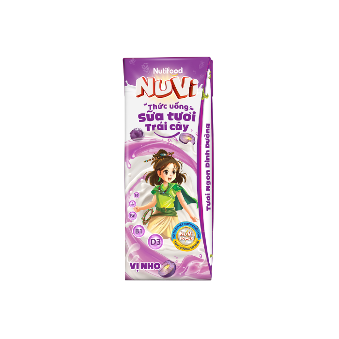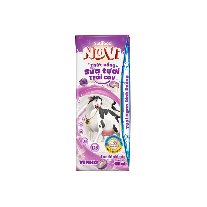 NuVi Thức Uống Sữa Tươi Trái Cây Vị Nho   được làm từ sữa tươi sạch từ trang trại bò sữa NutiMilk kết hợp cùng nước ép trái cây mang đến hương vị thơm ngon dinh dưỡng mỗi ngày.