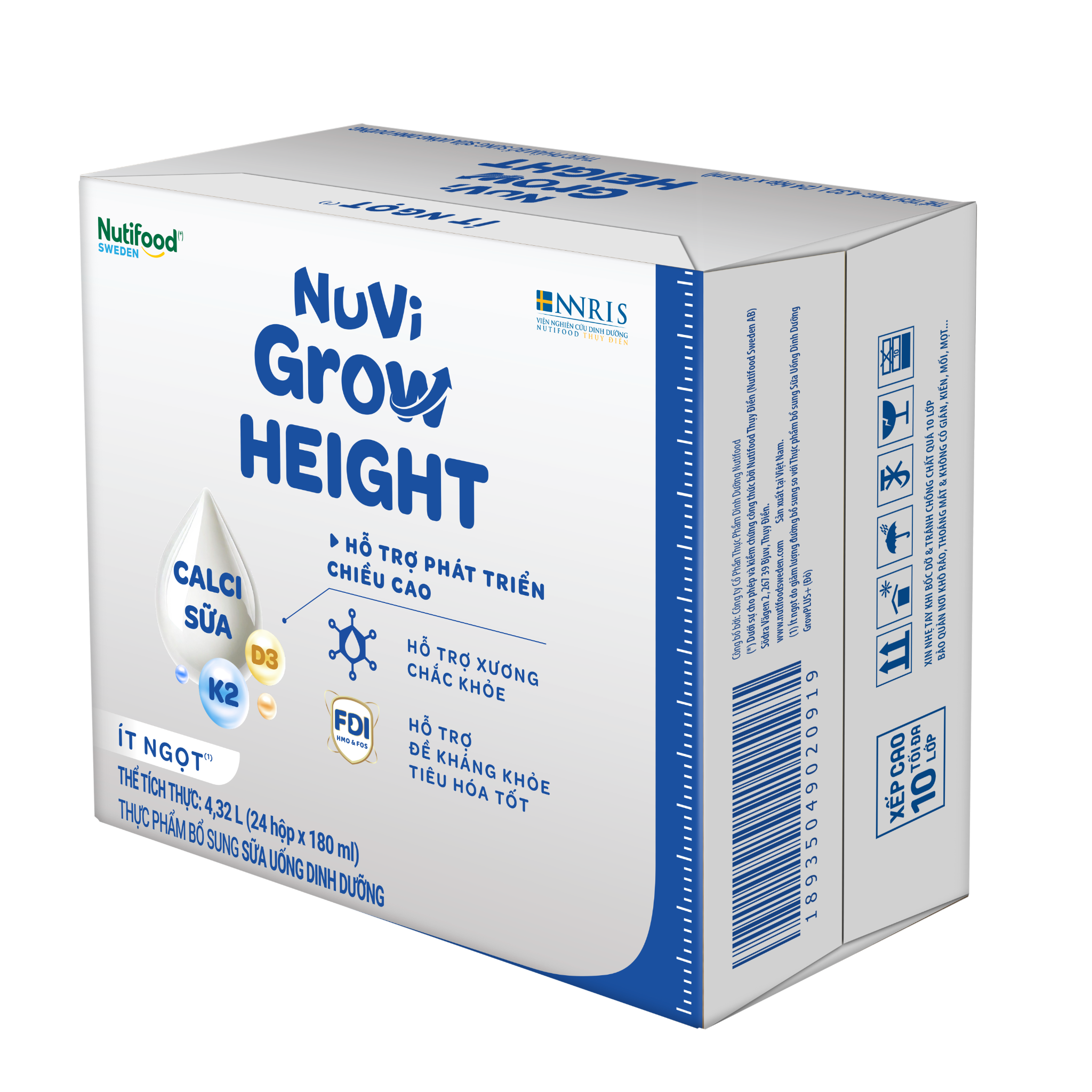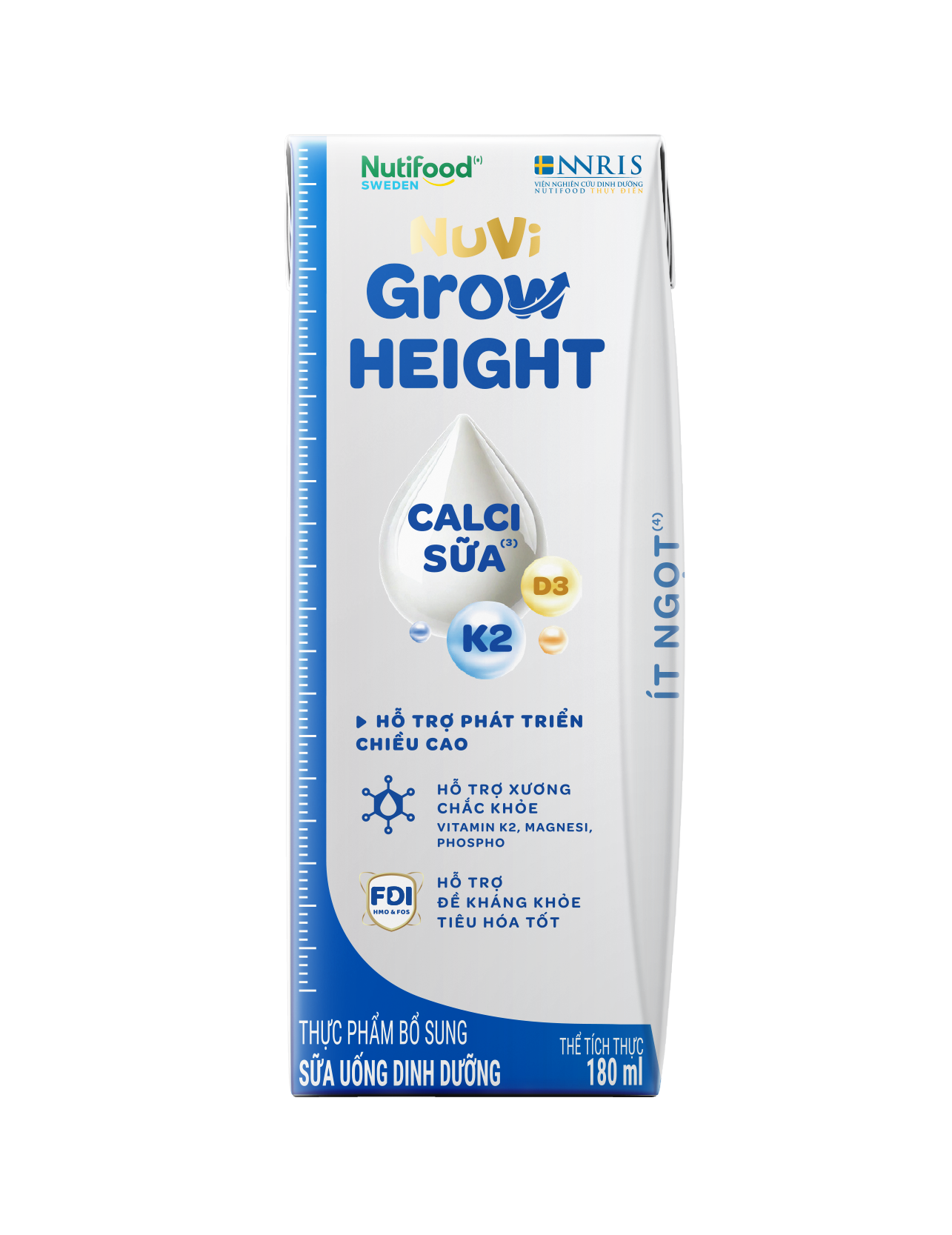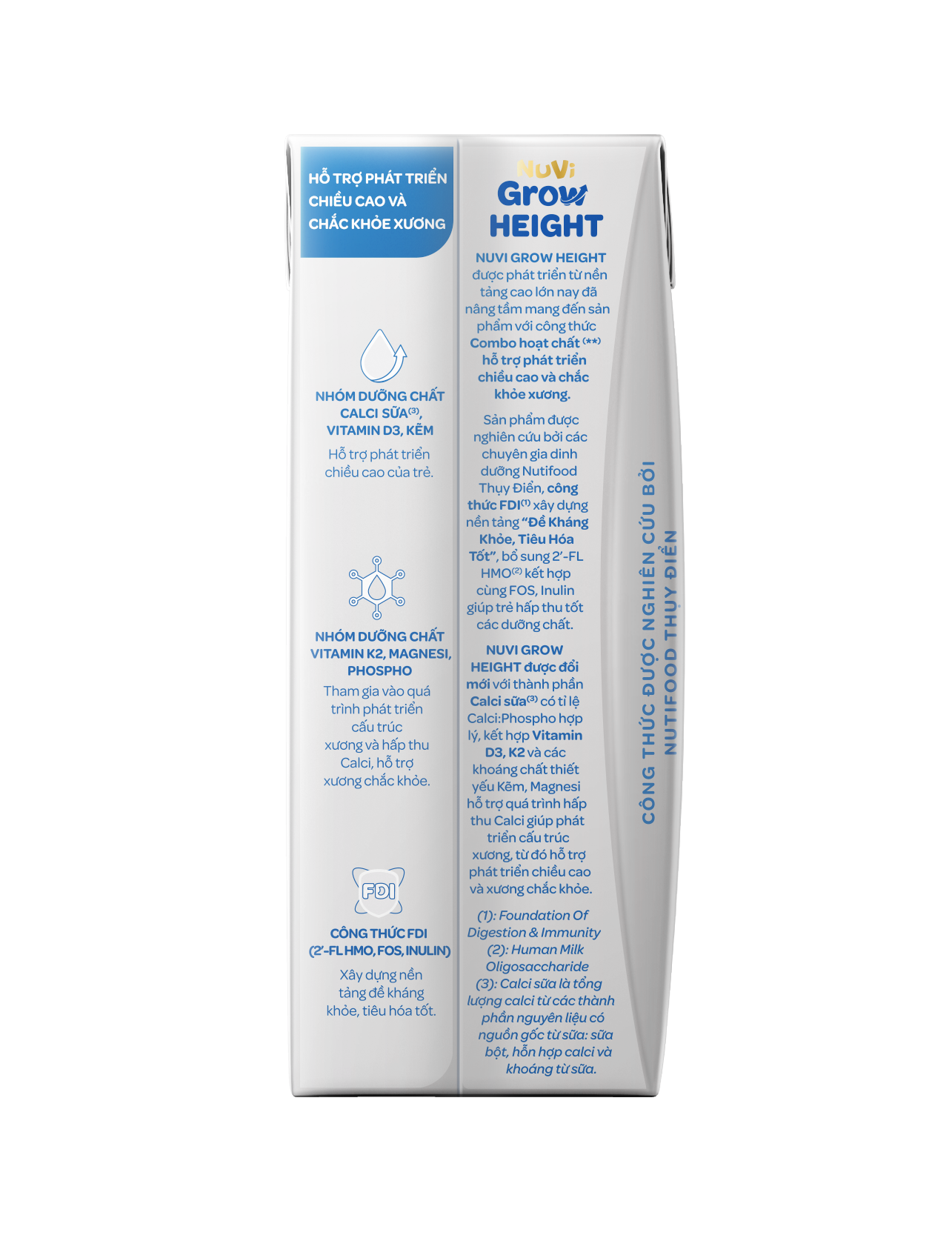 NUVI GROW HEIGHT được phát triển từ nền tảng cao lớn nay đã nâng tầm mang đến sản phẩm với công thức Combo hoạt chất(**) hỗ trợ phát triển chiều cao và chắc khỏe xương. Sản phẩm được nghiên cứu bởi các chuyên gia dinh dưỡng Nutifood Thụy Điển, công thức FDI(1) xây dựng nền tảng “Đề Kháng Khỏe, Tiêu Hóa Tốt”, bổ sung 2’-FL HMO(2) kết hợp cùng FOS, Inulin giúp trẻ hấp thu tốt các dưỡng chất.